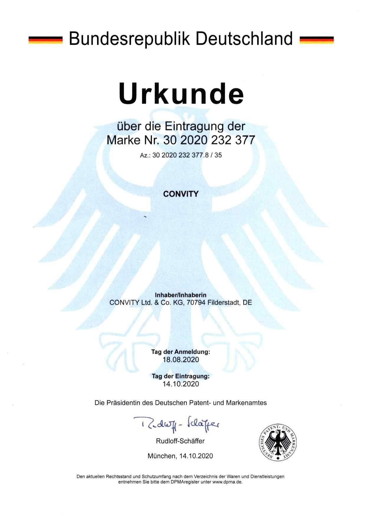 CONVITY wurde im Herbst 2020 vom Deutschen Patent- und Markenamt als Marke eingetragen.